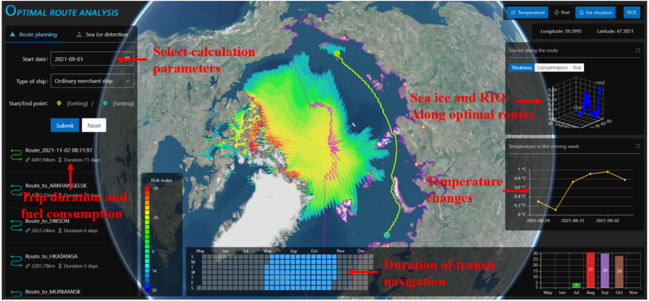 中国科学院西北生态环境资源研究院(以下简称“西北研究院”)车涛研究员团队基于地球大数据云平台,开发了一个在线可交互的航线智能规划系统(RouteView),为北极船舶航行提供短-中期规划,进一步提升北极通航信息服务水平。RouteView从两个方面突破北极航道信息服务的智能化水平:(1)在深度强化学习支持下,可计算不同条件约束下未来60天最优航线分布。(2)基于U-Net深度学习模型,实现北极局部地区海冰和海水在线自动分类。相比已有北极信息服务系统,RouteView能够实时处理海量数据,能够规划出时效性更高、更为安全经济的航线,从信息提取方式和计算效率等方面提高了北极航道信服服务的智能化水平,对“冰上丝绸之路”发展提供一定的决策依据。